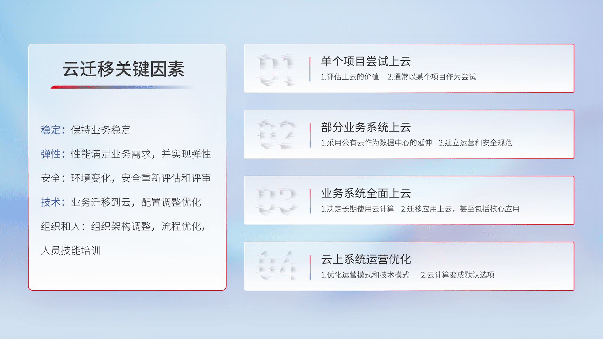 结合实际业务,,从规划设计、、云平台选型、、云原生改造、、、、数据迁移、、集成交付,,,迁移全过程为客户识别最佳上云路径,,,,做好风险识别管理,,,设计网络架构、、身份权限、、安全审计合规、、、操作审计、、日志审计、、监控告警策略、、、、多站点容灾设计等,,,,对云上基础设施进行整体规划,,,提升IT治理水平,,以满足弹性、、高可用、、、、高性能的需求。。