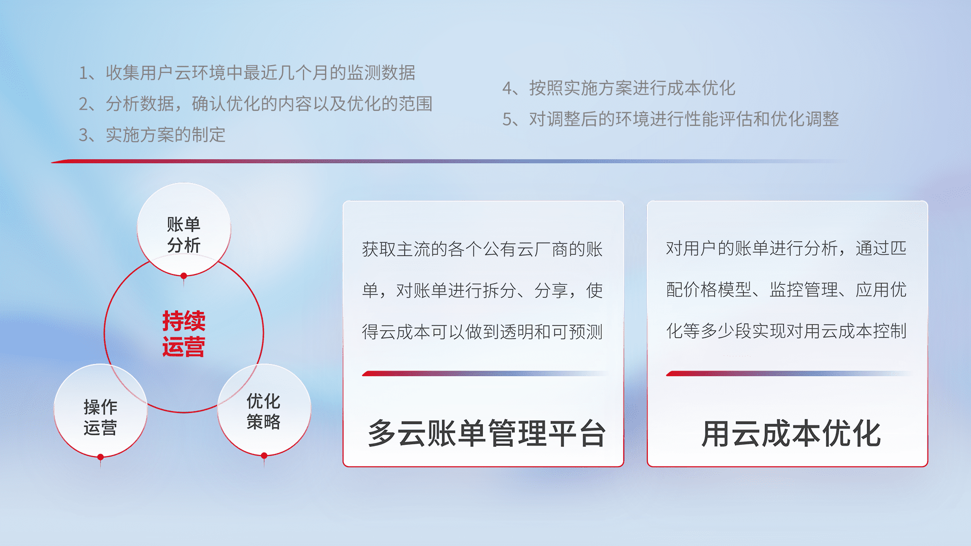 通过多云纳管,,以统一的资源数据模型把客户的云资源进行抽象和封装,,进而实现对多云资源的统一操作,,,保障云资源管理的可靠性、、、、稳定性与可用性。。量身定制化运维内容,,,配置、、开发运维、、、补丁管理、、、、备份、、、、监控、、、、认证和访问管理、、审计和日常巡检等,,,保障在用云过程中的可靠度,,,稳定度以及高可用率。。